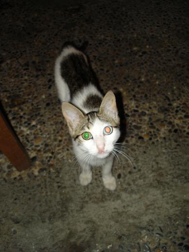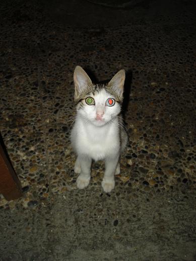 フラッシュをたいたら、目がエメラルドとルビーになりました。