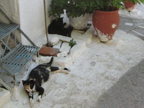 アナフィオティカの民家の屋根、塀の上には、猫がたくさんいます。