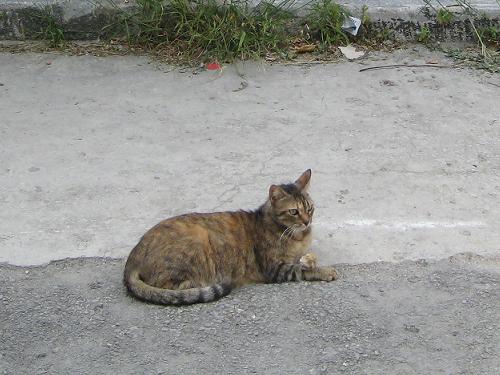 外で過ごすには気持ちいいにゃ。 道路にぺたーっ。