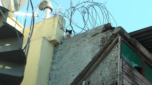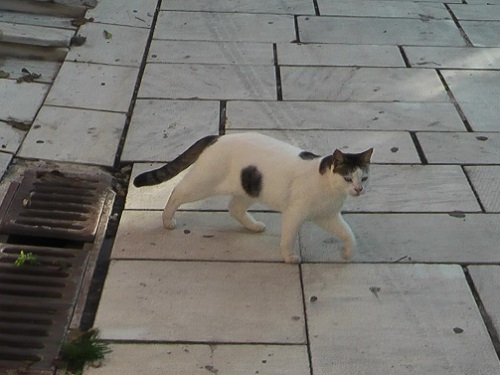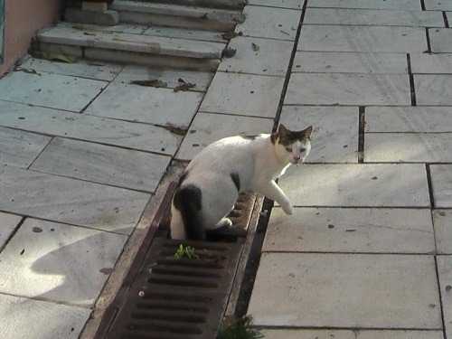 この猫さんはこの階段道から喫茶店を通り越して風の塔の南フェンスまでをテリトリーとしています。何か怖いことがあると、喫茶店のマネージャーさんや従業員さんのそばにいます。飲料水もいつもきれいです。この喫茶店の東へ行くとレストランがたくさんあります。