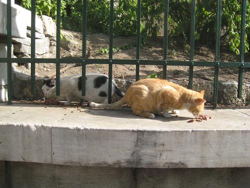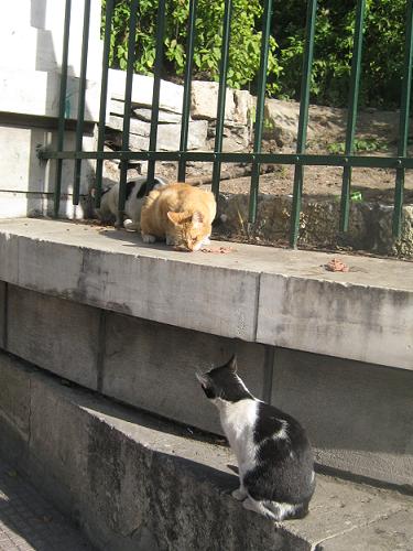 こんなところにも猫が3匹いて、ゴハンをもらっています。警察官があげているのかしら?