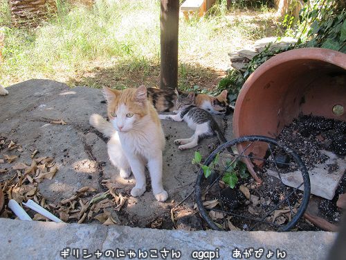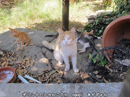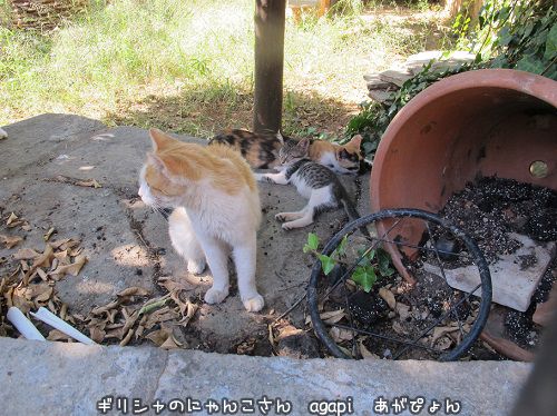 どなたかがアクロポリスの斜面から、仔猫集団をこの小さな庭に移したのかもしれません。