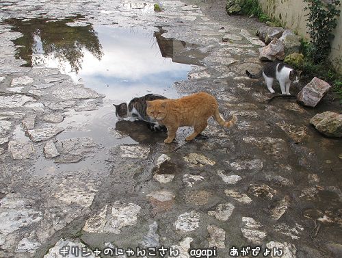 雨が降ったんだよ。にゃんこの湖ができちゃって、みんな大喜び。