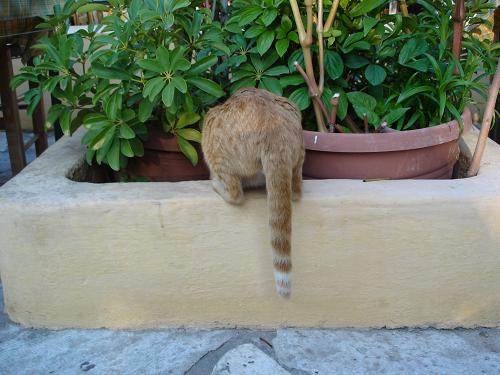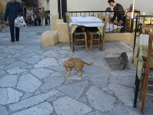 ここのお店の飼猫のミツォスは近所のノラちゃんたちと遊んでいて、
