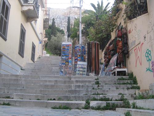 この階段道を上ると入口があって、突き当たりからアクロポリスに行けます。