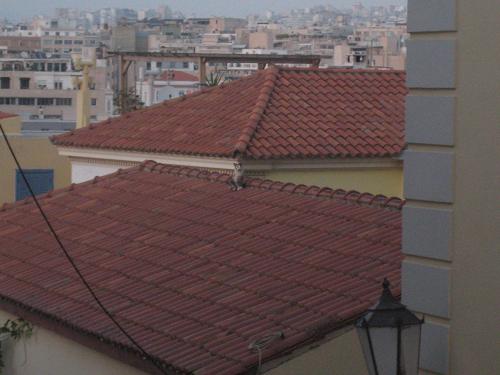 三毛猫ヨッコは階段道で犬に追われて屋根の上にいる。