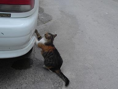 綿新そばに座って小さい声でにゃ、にゃ、と言います。なんとなく嬉しいです。車のタイヤでよく爪とぎやっています。