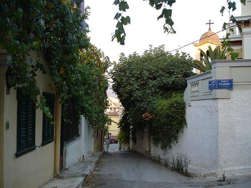 右側の上のほうに聖ニコラオス教会の鐘塔が見えます。