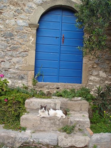 モネムヴァシアのメインロードです。ここにもお土産やさんの猫がいました。