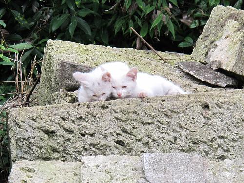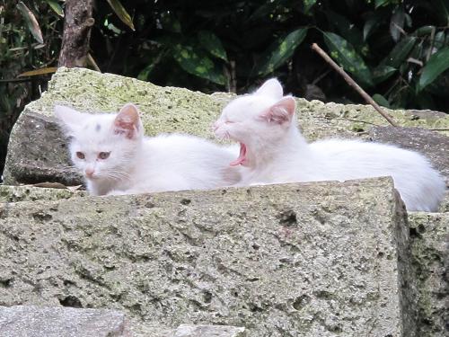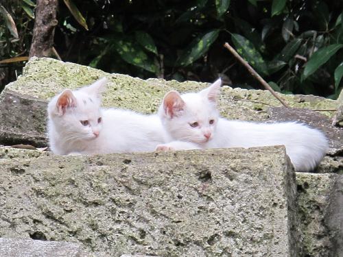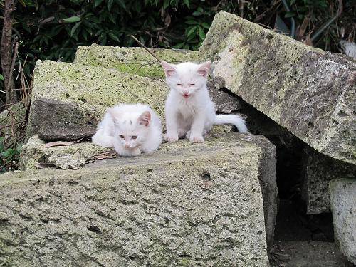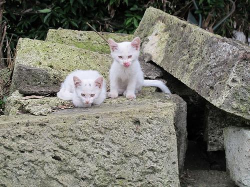 野良の双子猫は右猫には頭に八の字の黒い毛がうっすらとあり、
