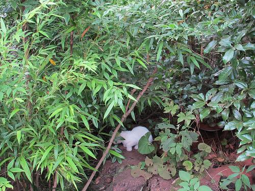 アイボーのシロキチは生垣の隙間を通過し残飯置き場に突入にゃ。