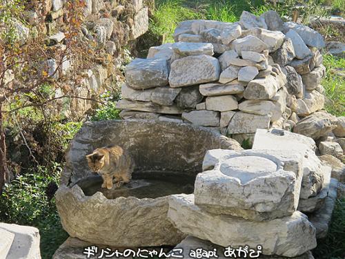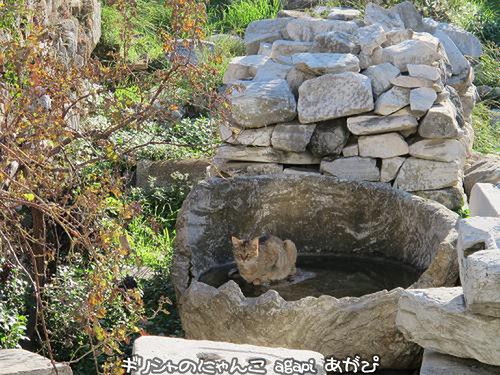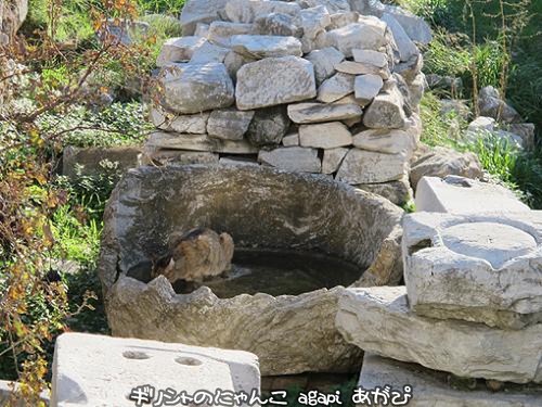 ごくごくごく、うまいにゃ~。こんな石の水盤で飲めるなんて豪華だわ。