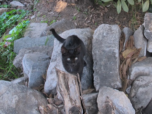 この黒仔猫とキジ仔猫のお母さんは廃材奥置場にいて違うチームですが、トビーさんがこのチームににらみをきかせています。