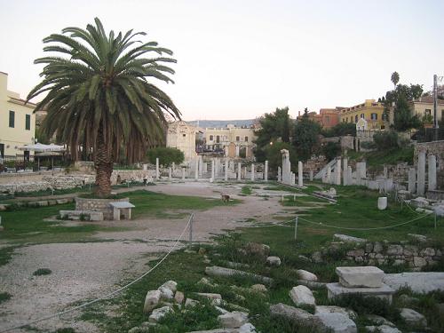 風の塔とローマ時代アゴラの中央を芝生の上をゆっくり野良犬のミツォスが歩いていました。