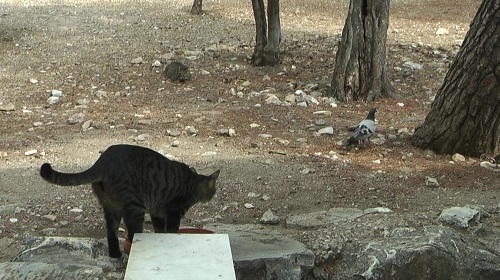 猫も鳩も動かず、猫も普段は仲良しなのに、猫は気まぐれだ。
