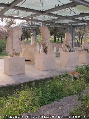 アクロポリスの南東斜面のディオニュソス古代劇場の出土品展示コーナーに猫たちが暑い日は寒い日は屋根があるので集っている。