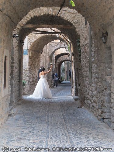 ヒオス島メスタの町中で婚礼衣装のカップルが記念撮影中。