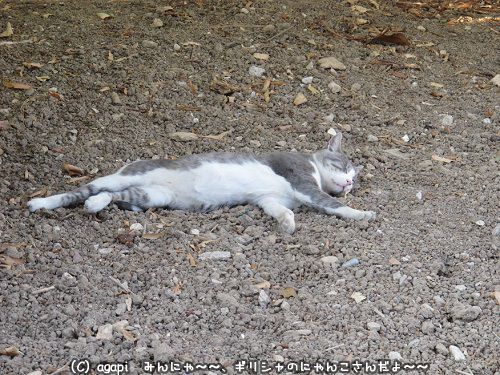邸宅の庭の土の上に寝倒れしているにゃんこさん。土はポカポカ。