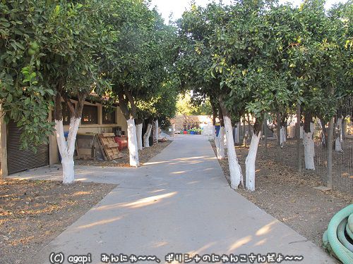 庭の中のコンクリート道路わきにマンダリンの木が並んでいる。