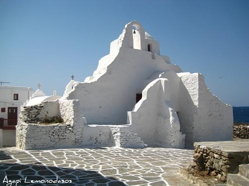 ミコノス島の海岸沿いを歩く白い教会があって、