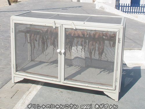 網のついた箱の中で干されているタコさんたち。おいしそうだ。